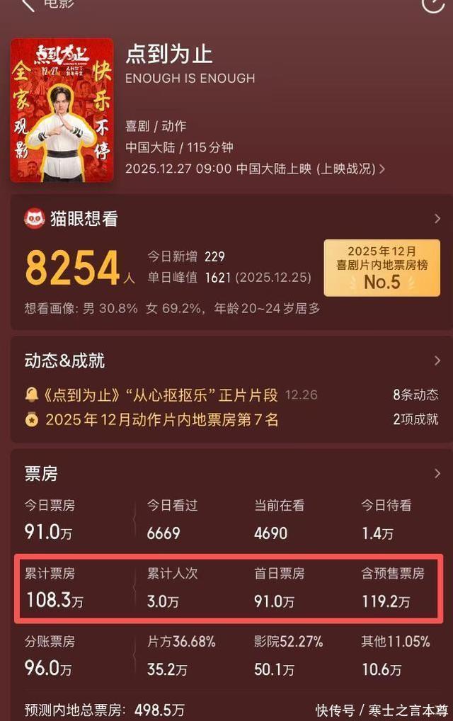 电影《点到为止》今天上映,首日票房只有108万,排片量接近九成,却只占票房的百分之一,这部片子成本高达一亿元,请来许多喜剧演员主演,费翔和彭昱畅也友情客串,可观众看完纷纷摇头,认为笑点生硬、故事零散炒股配资官网,根本没有一条完整的主线。