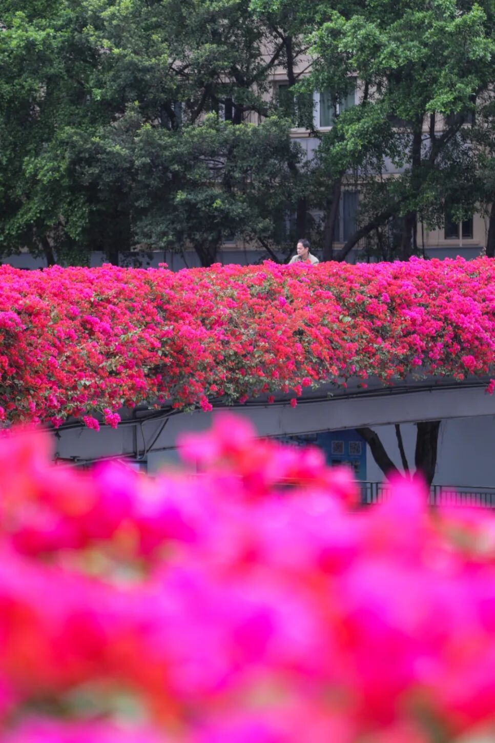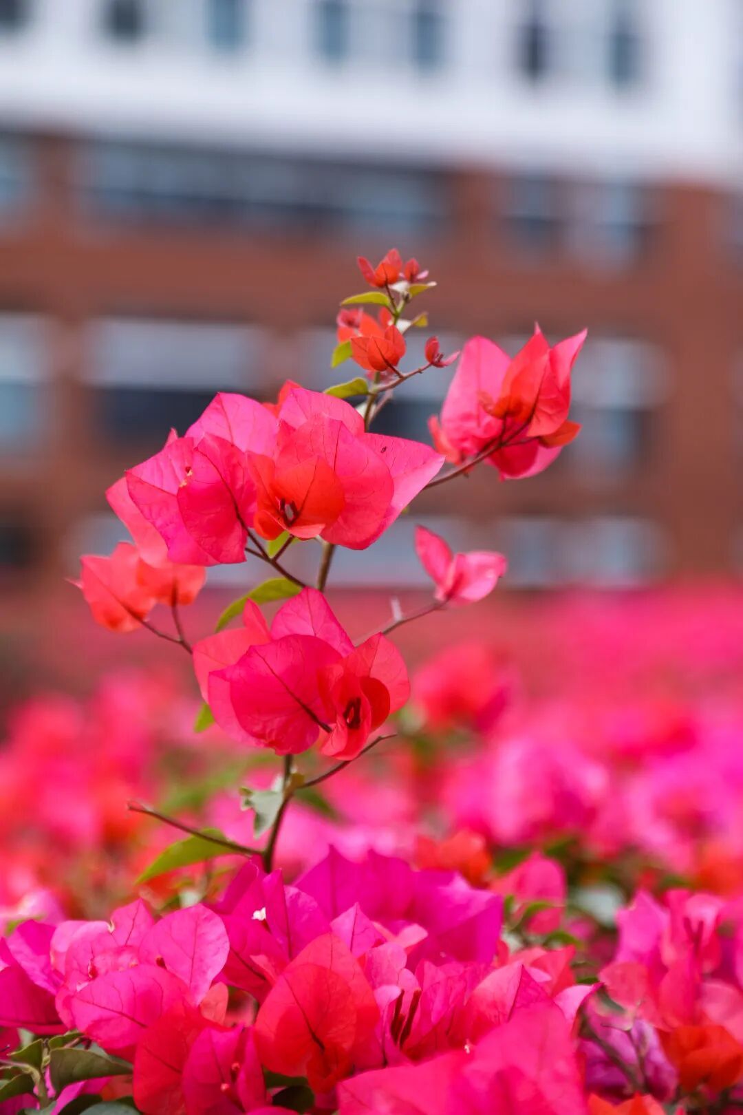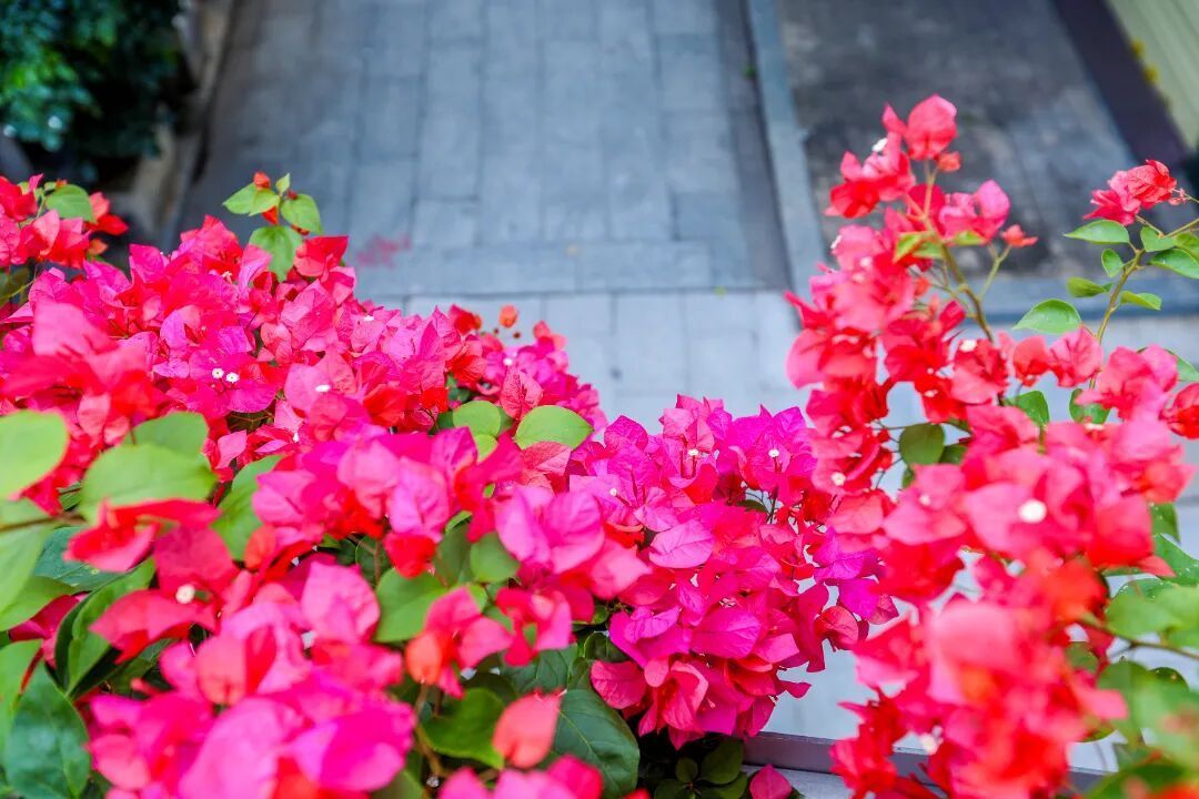 三角梅开得热烈张扬。朱红色的苞片如纸似绢,生命力蓬勃,一丛丛,一簇簇,如同彩霞,洒满街头。