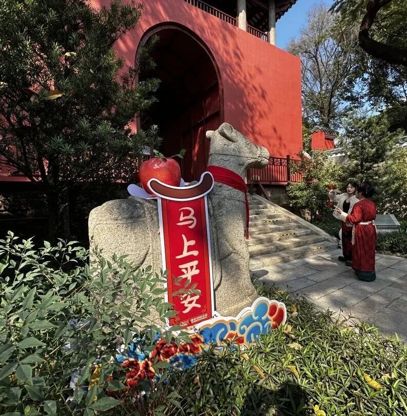 近日,五仙观内结合清·石马文物设置打卡装置,象征奔腾向前、马到成功。活动持续至3月9日,市民朋友可前往五仙观拍照打卡这些装置,把好运带回家。
