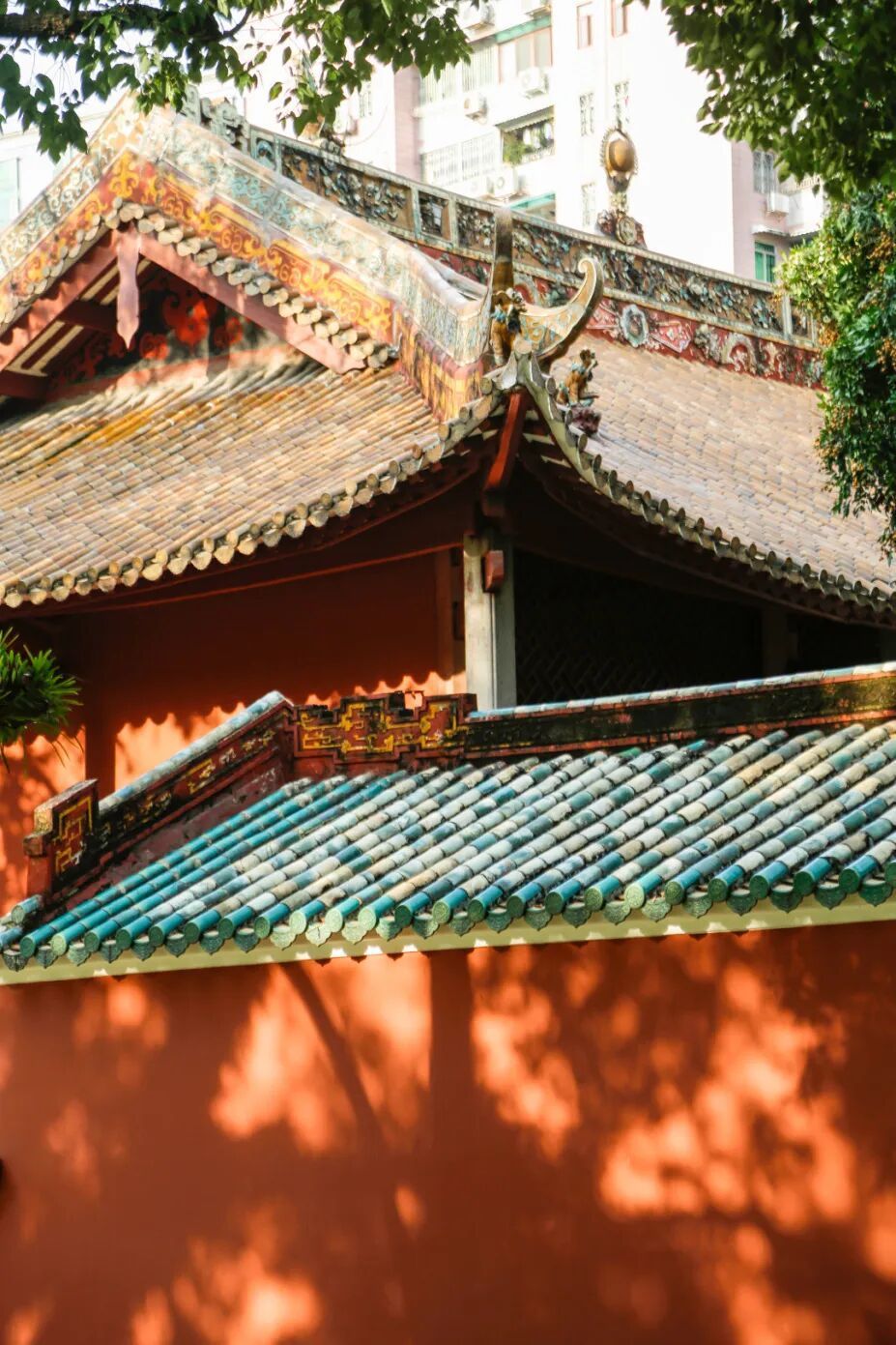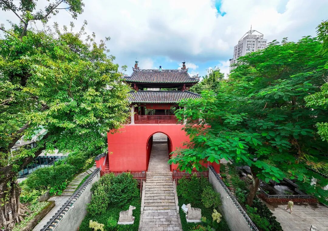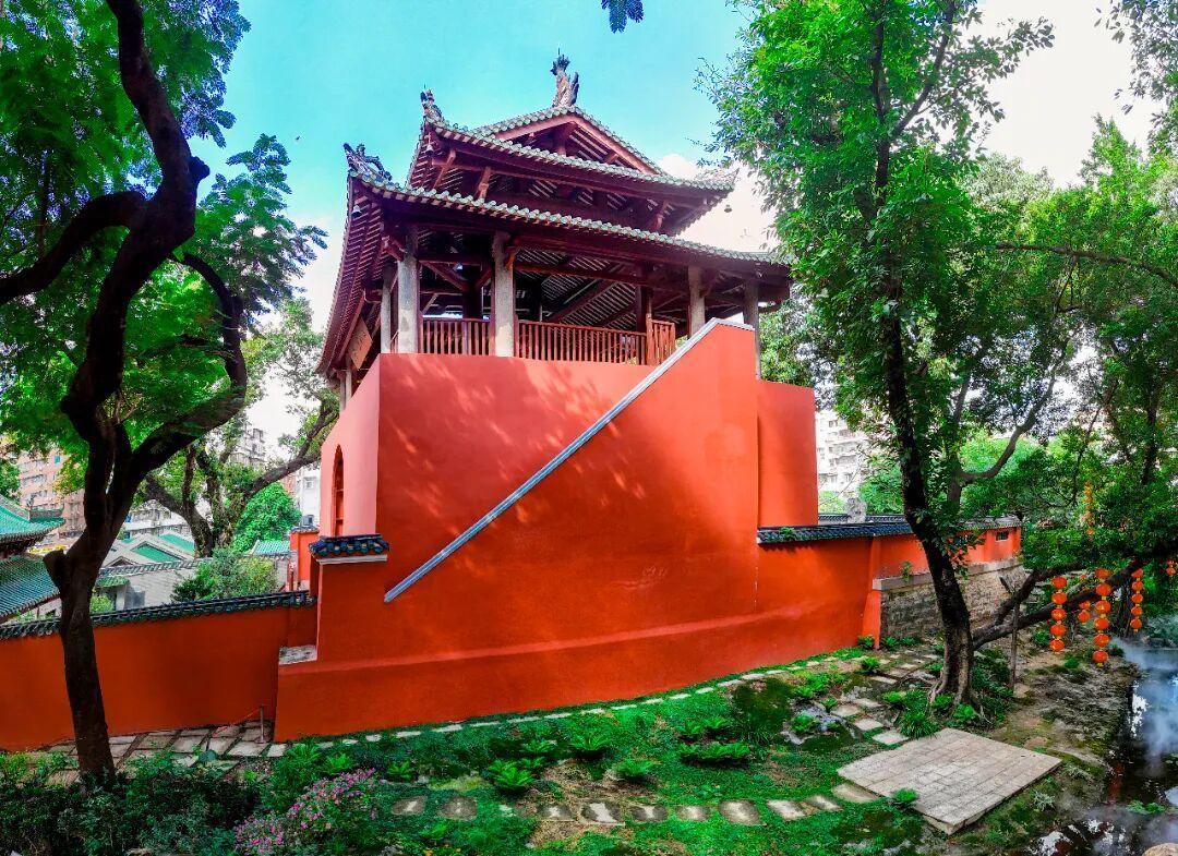五仙观里,一座气势恢宏的岭南第一楼赫然入目。此楼建于明洪武七年(1374年),因其宏伟壮观,被明末清初学者屈大均誉为广州“四大崇楼”之一,又因修建年代最早,赢得了“第一楼”的美誉。红墙绿树相互掩映,氛围感十足。