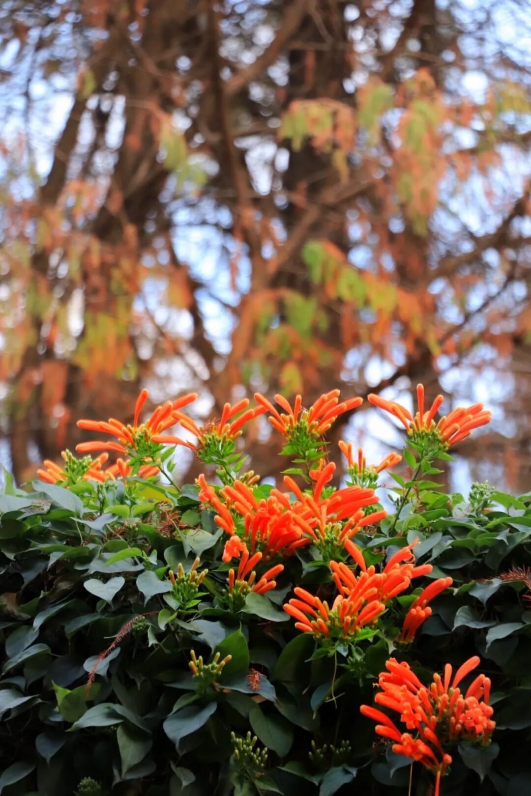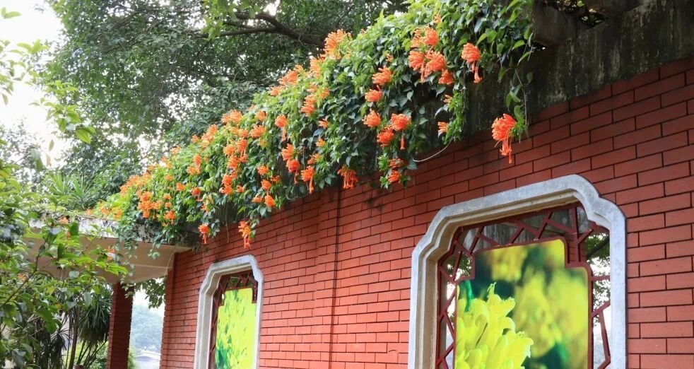 炮仗花以热烈的橙红铺就岭南新春的喜庆底色。艳丽的花色象征红红火火,成串的花型寓意团圆和睦。一串串花穗垂挂亭廊,如鞭炮倾泻而下,在暖阳中泛着鎏金光泽。
