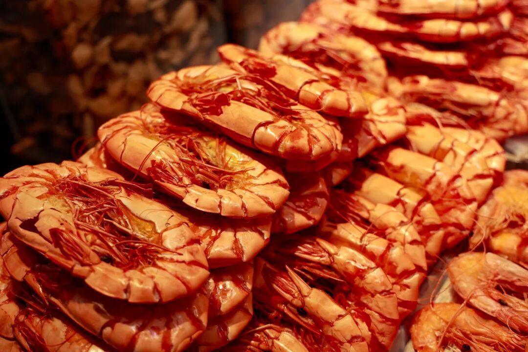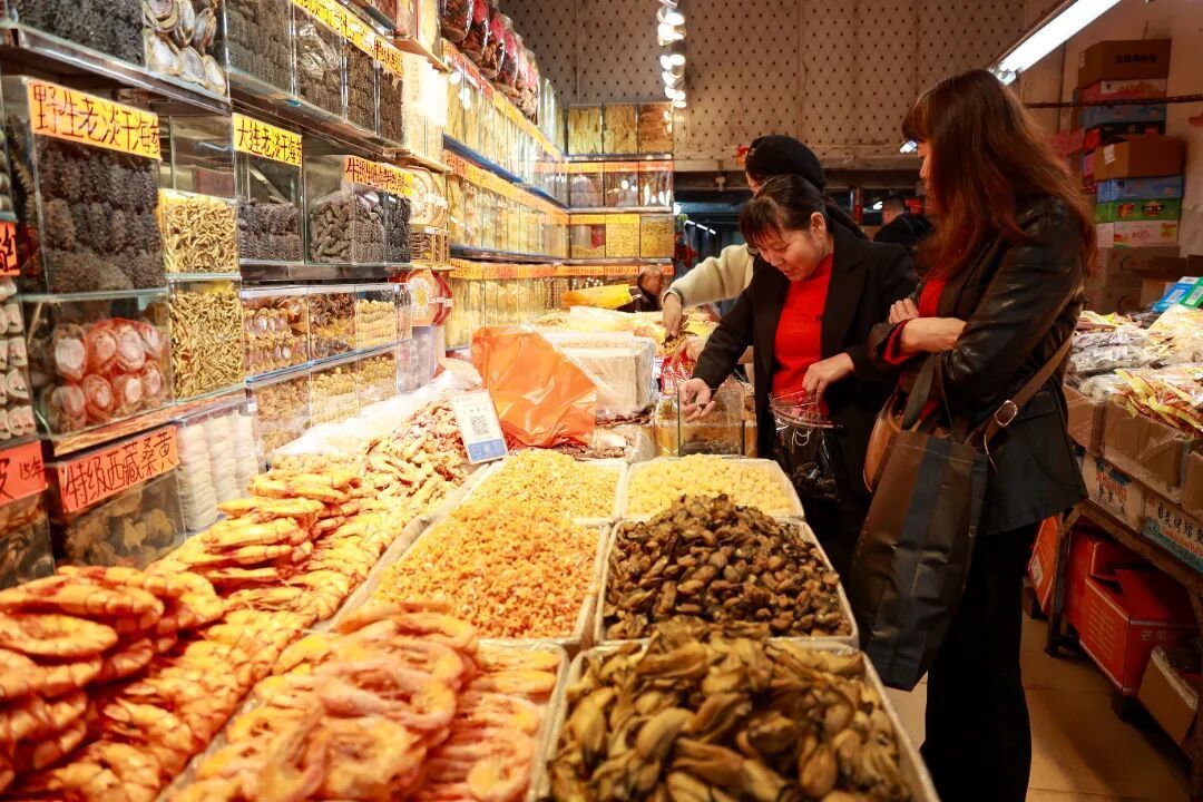 红彤彤的虾干缀满竹篮,鲍参翅肚的鲜香不经意钻进鼻尖。往来游人的笑意、商贩的吆喝声,交织出一幅热闹鲜活的年味画卷。